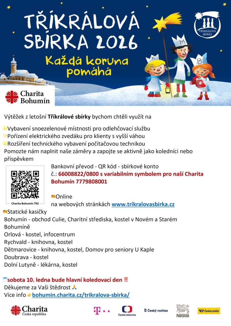 Výtěžek z letošní Tříkrálové sbírky bychom chtěli využít na: Vybavení snoezelenové místnosti pro odlehčovací službu Pořízení elektrického zvedáku pro klienty s vyšší váhou Rozšíření technického vybavení počítačovou technikou Pomozte nám naplnit naše záměry a zapojte se aktivně jako koledníci nebo příspěvkem: Bankovní převod - QR kód - sbírkové konto č.: 66008822/0800 s variabilním symbolem pro naší Charita Bohumín 7779808001 Online na webových stránkách www.trikralovasbirka.cz Statické kasičky: Bohumín - obchod Culie, Charitní střediska, kostel v Novém a Starém Bohumíně Orlová - kostel, infocentrum Rychvald - knihovna, kostel Dětmarovice - knihovna, kostel, Domov pro seniory U Kaple Doubrava - kostel Dolní Lutyně - lékárna, kostel sobota 10. ledna bude hlavní koledovací den Děkujeme za Vaši štědrost Více info na bohumin.charita.cz/trikralova-sbirka/