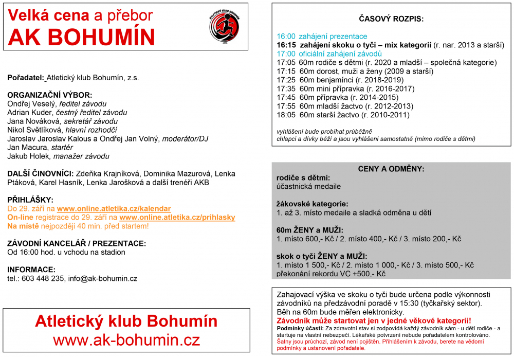 "Těšíme se na běžce všech věkových kategorií. Věříme, že se rozloučíme s letošní dráhovou sezónou v dobré náladě a uvidíme opět kvalitní tyčku, kde se loni podařilo pokořit 500 cm", říká předseda atletického klubu Ondřej Veselý.