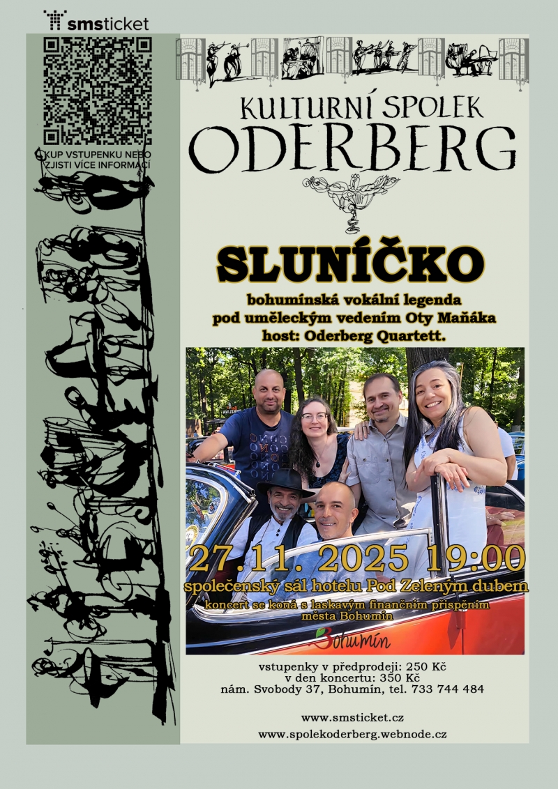STARÝ BOHUMÍN - Pod Zeleným vyjde Sluníčko! Nenechte si ujít hudební bonbonek v podobě koncertu bohumínské vokální skupiny, která si jako hosty pozvala místní Oderberg Quartett. V sále hotelu a společenského domu Pod Zeleným dubem ve Starém Bohumíně ve čtvrtek 27. listopadu od 19 hodin. Vstupenky zakoupíte zde.