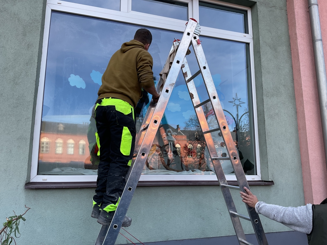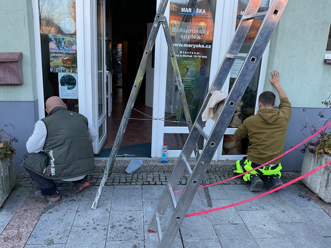 NOVÝ BOHUMÍN – Dva statní chlapi, štafle, zásoba čisticích prostředků a jedna velká auslága neboli obří výklad. Spolku Maryška s jeho předvánoční údržbou pomohli dobrovolníci, Dominik a Petr Biernatovi z Bohumína.