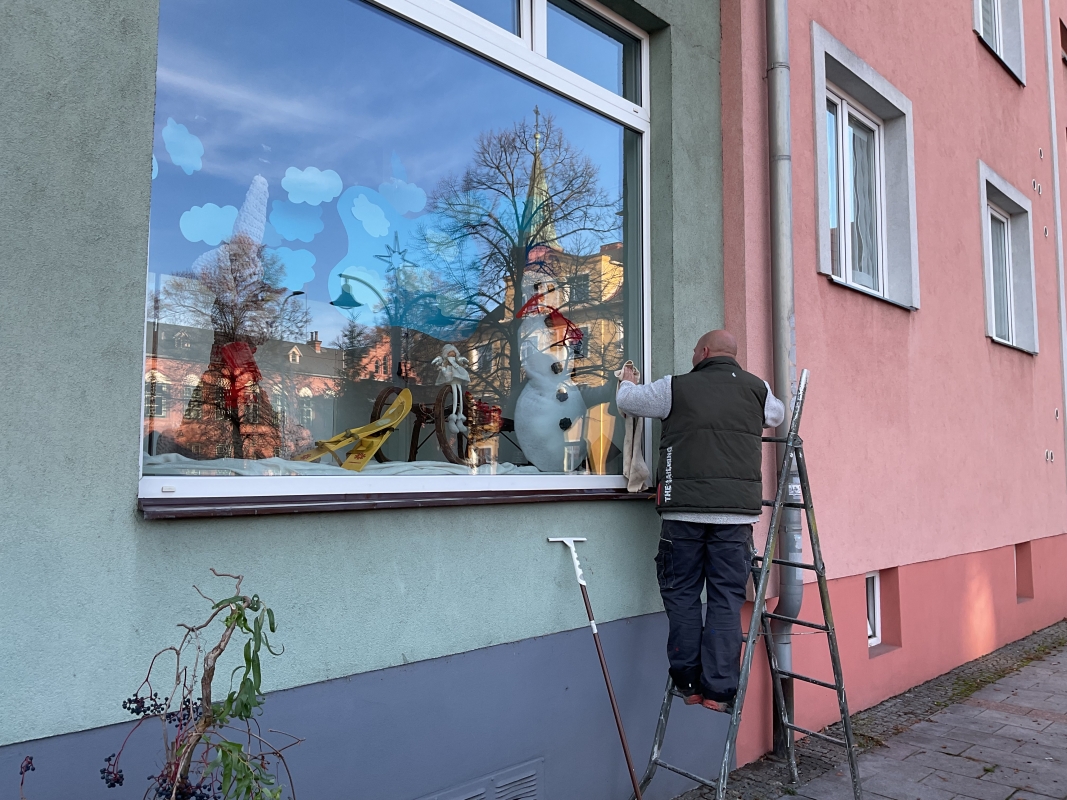 Pánové jako dva zruční akrobaté žonglovali na žebříku s hadrem, myli a leštili. „Výloha si péči zaslouží. Krojovanky v ní opět uvedou vánoční scénu, ve které nebude chybět například sněhulák. Těšíme se na novou, krásnou novou výzdobu na náměstí a také my svou malou troškou chceme ke sváteční atmosféře v centru přispět,“ doplnila Kamila Smigová.