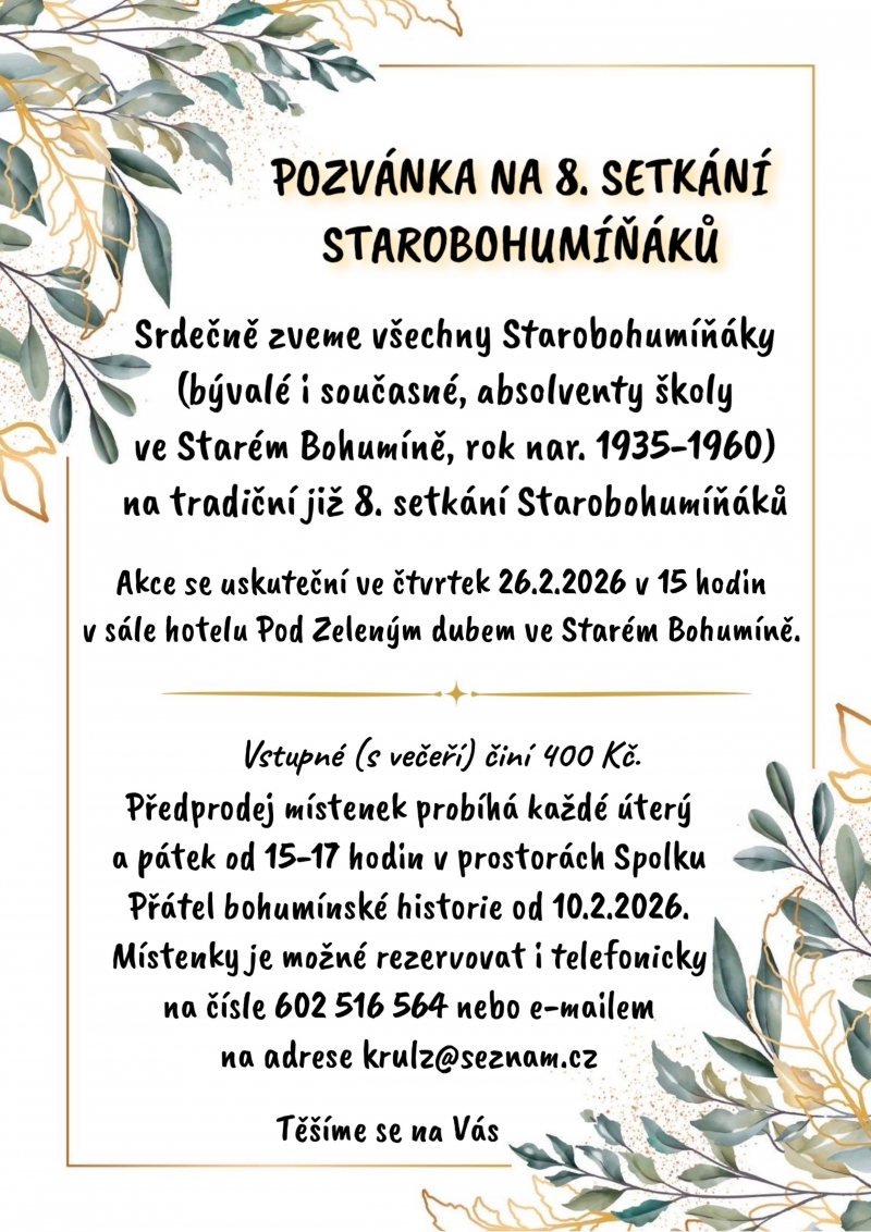 STARÝ BOHUMÍN – Jednou Starobohumíňák, navždy Starobohumíňák. Současní obyvatelé této městské části Bohumína, také bývalí, a hlavně absolventi tamní školy (ročník narození 1935-1960) se sejdou v hotelu Pod Zeleným dubem. Již osmý sraz plánují na čtvrtek 26. února od 15 hodin.
