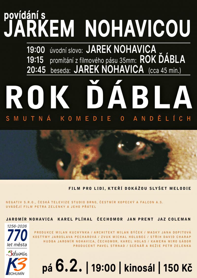 Když Jarek Nohavica 4. září 2025 uvedl svůj film Jarek ve zcela zaplněném letním kině, stěží by někoho napadlo, že se k nám do Bohumína vrátí ani ne po půl roce a vstoupí do projektu, který je v kontextu doby zcela ojedinělý. Osobně zavzpomíná na vznik a natáčení filmu Rok ďábla z roku 2002, na práci s režisérem Petrem Zelenkou, na návrat do léčebny, kde strávil několik měsíců a mnoho dalšího. Večer, ale bude ojedinělý i něčím dalším. Film uvedeme z dochované 35 mm filmové kopie a technologie mechanického filmového projektoru, která se běžně používala před příchodem digitálního promítání. Diváci tedy zažijí autentický večer, podobný tomu v roce 2002 a co víc, setkají se tváří v tvář se zpěvákem, písničkářem, ale předevsím člověkem - Jarkem Nohavicou. Povídat si s ním budeme před samotným promítáním filmu Rok ďábla, ale i po závěrečných titulcích.