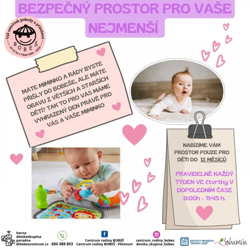 Bezpečný prostor pro vaše nejmenší, aniž byste se báli větších dětí. Kdy: každý čtvrtek, dopoledne (9:00-11:45) Rezervace není nutná. Přijďte si k nám s vašimi nejmenšími ratolestmi užít naši herničku ...