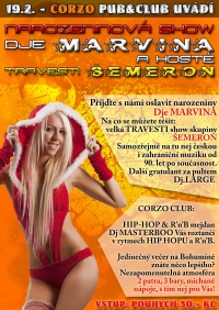 Corzo Pub&Club zve na oslavu narozenin DJ Marvina. V programu se objeví travesti show skupiny Šemeron. Samozřejmostí je nej česká i zahraniční muzika od 90. let po současnost. Dalším gratulantem z ...