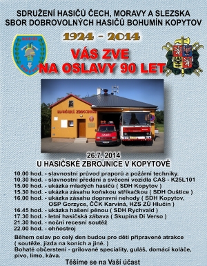 Sbor dobrovolných hasičů Kopytov zve na oslavy 90. výročí vzniku. V sobotu 26. července u hasičské zbrojnice v Kopytově od 10 hodin. Oslavy zahájí slavnostní průvod praporů a techniky, následuje před ...