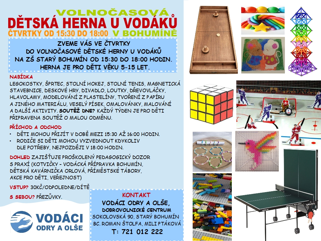 Zveme vás ve čtvrtky do volnočasové Dětské herny u vodáků na ZŠ Starý Bohumín od 15:30 do 18:00 hodin. Herna je pro děti věku 5-15 let. Dohled zajišťuje proškolený pedagogický dozor s bohatou praxí (Kotvičky Bohumín, Dětská kavárnička Orlová, příměstské i pobytové tábory, výlety...) Příchod? Děti mohou přijít v době mezi 15:30 až 16:00 hodin. Odchod? Rodiče si děti mohou vyzvednout kdykoliv dle potřeby, nejpozději v 18:00 hodin. Nabídka? Legokostky, šprtec, stolní hokej, stolní tenis, magnetická stavebnice, deskové hry, divadlo, loutky, dřevovláčky, hlavolamy, modelování z plastelíny, tvoření z papíru a jiného materiálu, veselý písek, omalovánky, malování a další aktivity. Soutěž dne? Každý týden je pro děti připravena soutěž o malou odměnu. Cena? 30Kč / odpoledne / dítě S sebou? Přezůvky. Kontakt? Vodáci Odry a Olše, Dobrovolnické centrum, Sokolovská 90, Starý Bohumín Bc. Roman Štolfa, Mili Ptáková autor letáku: Roman Štolfa autor loga: Pavla Dejová