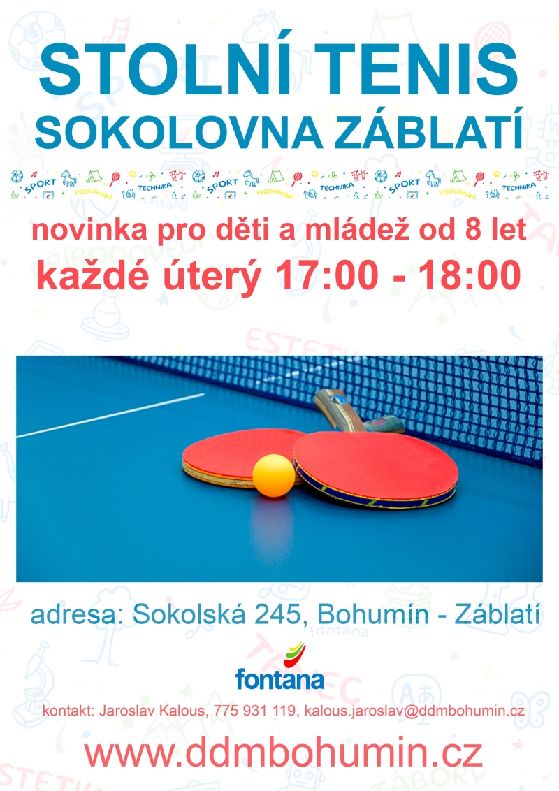 Novinkou je také kroužek stolního tenisu pro děti ve věku od 8 let, který TJ Sokol Záblatí otevírá ve spolupráci s bohumínským domem dětí a mládeže. V sokolovně bude fungovat každé úterý odpoledne.