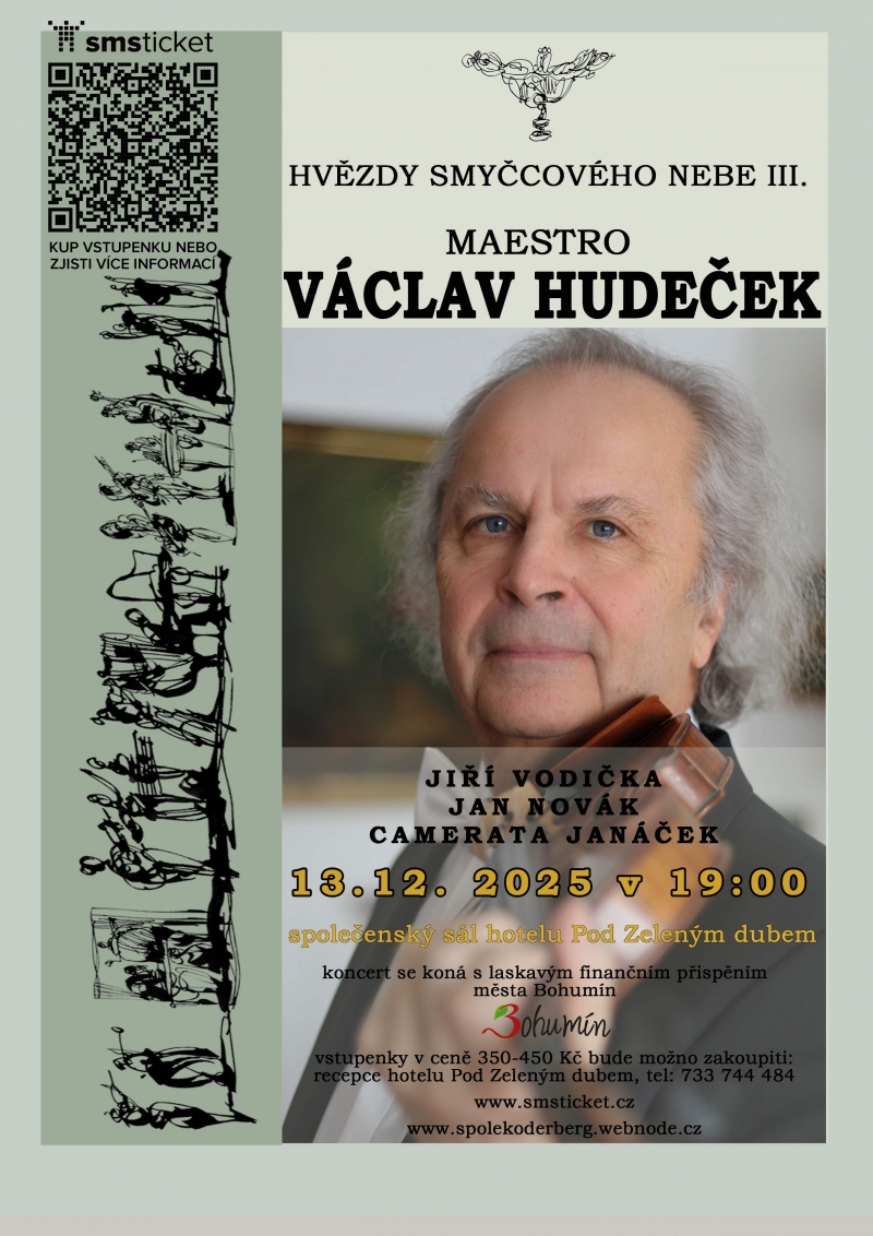 STARÝ BOHUMÍN – Uchu lahodící příjemná vánoční koncentrace tónů nejen houslí. Hvězdy smyčcového nebe se sejdou ve Starém Bohumíně. Koncert, jehož hlavní hvězdou bude legenda české houslové scény Václav Hudeček, proběhne v sále hotelu Pod Zeleným dubem v sobotu 13. prosince od 19 hodin.