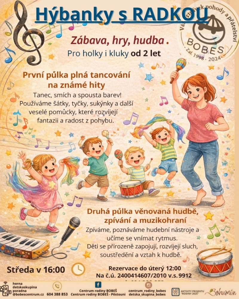 Hýbánky s Radkou Zábava, hry, hudba . Pro holky i kluky od 2let První půlka plná tancování na známé hity Tanec, smích a spousta barev! Používáme šátky, stuhy, sukýnky a další veselé pomůcky, které roz ...