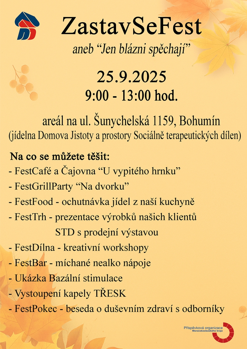 Kreativní workshopy, ukázka bazální stimulace, taky prodejní výstava rukodělných výrobků, ochutnávka jídel, káva, čajovna a gril party. „Také beseda o duševním zdraví s odborníky nebo koncert kapely Třesk. To a ještě více bude ZastavSeFest, který pořádáme už potřetí a s podtitulem „Jen blázni spěchají,“. Akce je určena široké veřejnosti,“ uvedla Helena Breniková, vedoucí služeb úseku přímé péče Domova Jistoty. ZastavSeFest se koná v zázemí krajského Domova Jistoty (jídelna za Lidlem) ve čtvrtek 25. září od 9 do 13 hodin.