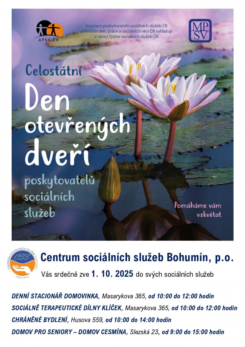 Městské Centrum sociálních služeb Bohumín se ve středu 1. října připojí k celostátnímu dni otevřených dveří poskytovatelů sociálních služeb. Zájemci si budou moci prohlédnout denní stacionář Domovinka (10-12 hod.), sociálně terapeutické dílny Klíček (10-12 hod.), chráněné bydlení v ul. Husova (10-14 hod.) a domov pro seniory Cesmína (9-15 hod.).