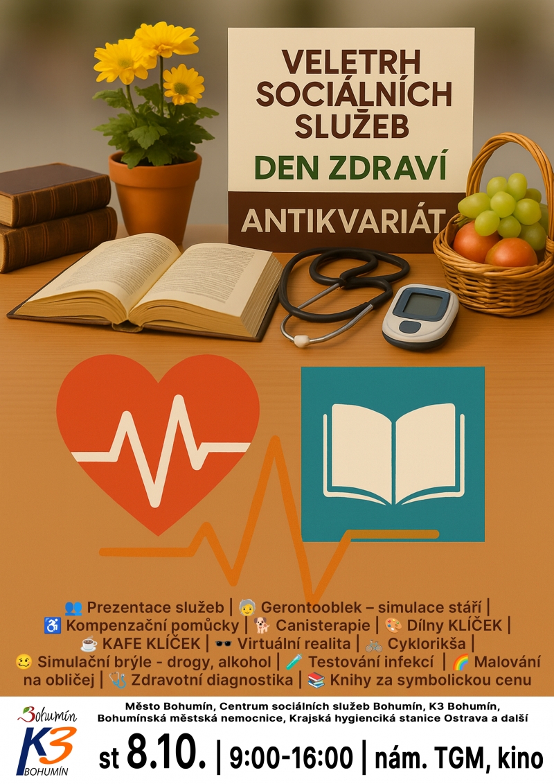 O týden později proběhne v Bohumíně velký Den sociálních služeb, který doplní knižní antikvariát a den zdraví. V centru Bohumína (nám. T. G. Masaryka, kino, Maryška, foyer kina) ve středu 8. října od 9 do 16 hodin.