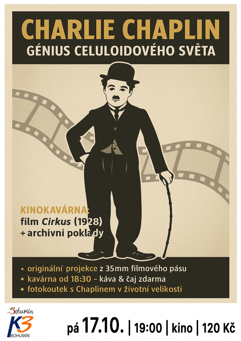 NOVÝ BOHUMÍN - Užijte si pravé filmové retro, v Bohumíně uvedou další Kinokavárnu. Její hvězdou bude jeden z největší filmových herců, komiků, režisérů. Charlie Chaplin: Génius celuloidového světa, komponovaný večer nabídne kino K3 v pátek 17. října od 19 hodin.