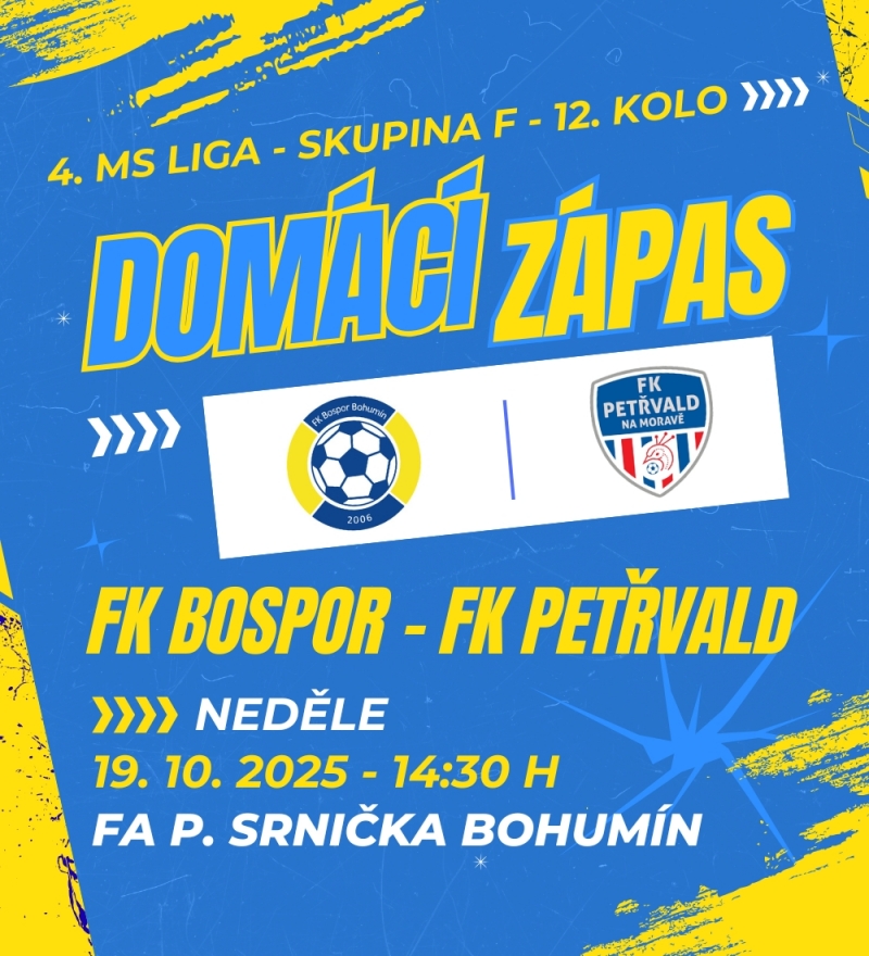 NOVÝ BOHUMÍN - Poslední dva zápasy fotbalového Bosporu skončily shodně remízou, a tak se tým propadl na čtvrté místo vyrovnané tabulky 4. Moravskoslezské ligy skupiny F. V neděli by se Bohumíňáci rádi vrátili na vítěznou vlnu, potřebují však porazit dalšího nepříjemného soupeře. Do areálu Pavla Srnička dorazí aktuálně šestý Petřvald, zápas začíná v 14.30 hodin.