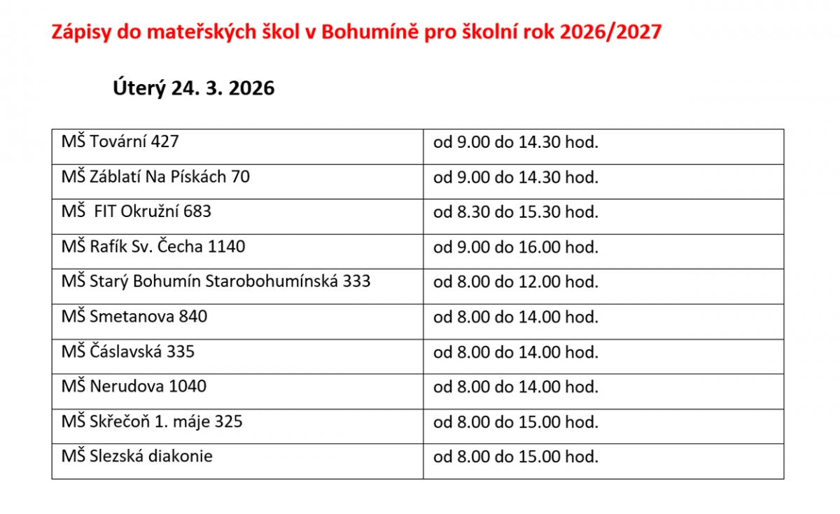 BOHUMÍN – Základní školy v Bohumíně zveřejnily harmonogram zápisů dětí do prvních tříd pro nový školní rok 2026/2027. Zápisy prvňáčků proběhnou v Bohumíně 21. a 22. ledna 2026 (dle rozpisu). Zápisy dětí do mateřinek se uskuteční v jednotném termínu 24. března 2026.
