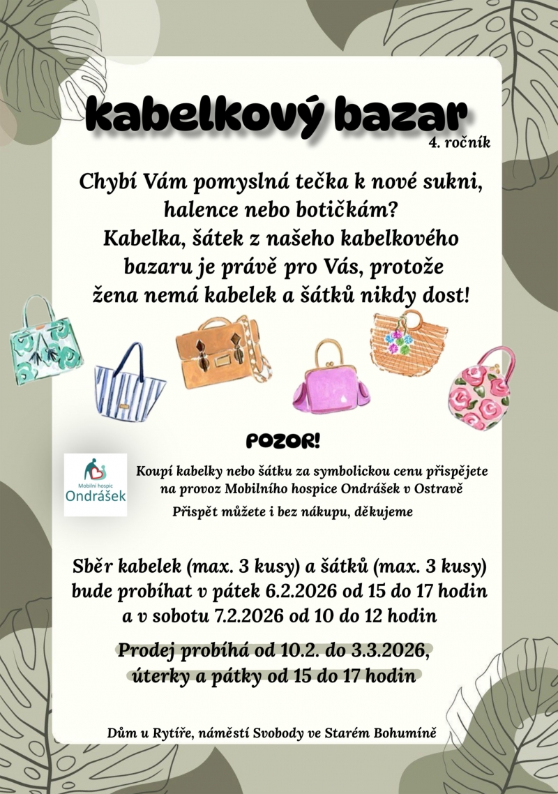 STARÝ BOHUMÍN – Kabelkový a šátkový bazar je zpět, znovu podpoří dobrou věc. Sběr zánovních kabelek a šátků bude zkraje února, prodej pak od 10. února do 3. března 2026. Vše se odehraje v klubovně v přízemí domu U Rytíře ve Starém Bohumíně.