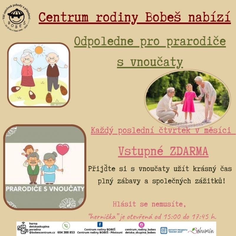 Přijďte si prarodiče užít s dětmi odpoledne plné smíchu, her a zábavy. VSTUP ZDARMA. Rezervace není potřeba.