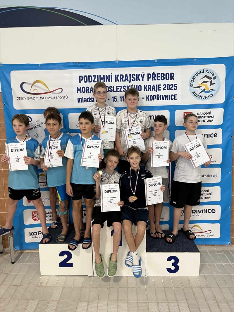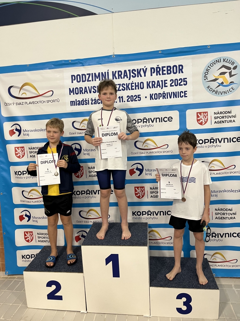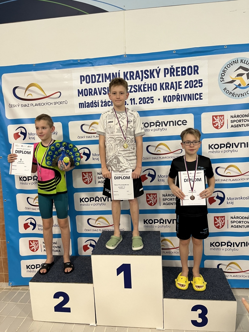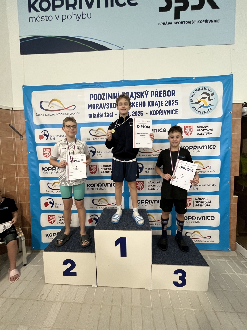 Výčet úspěchů z Kopřivnice doplnily medailové zisky desetiletých nováčků v závodnické skupině. Milan Humlíček přidal k individuálnímu bronzu ze závodu na 50 m motýlem týmové zlato ze štafety, Layla Babišová získala stříbro v polohovém závodě na 200 m a Valérie Veronesi bronz na padesátce motýl.