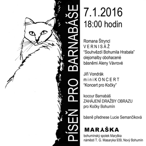 Romana Štryncl a výstava olejomaleb „Souhvězdí Bohumila Hrabala“ s básněmi Aleny Vávrové. Jiří Vondrák – koncert pro kočky, verše v podání Lucie Semančíkové a dražba obrazu, jehož výtěžek podpoří útul ...