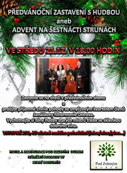 PŘEDVÁNOČNÍ ZASTAVENÍ S HUDBOU aneb ADVENT NA ŠESTNÁCTI STRUNÁCH Zastavte se na chvíli v předvánočním shonu a prožijte příjemné chvíle pohody spolu se smyčcovým kvartetem členů Janáčkovy filharmonie ...