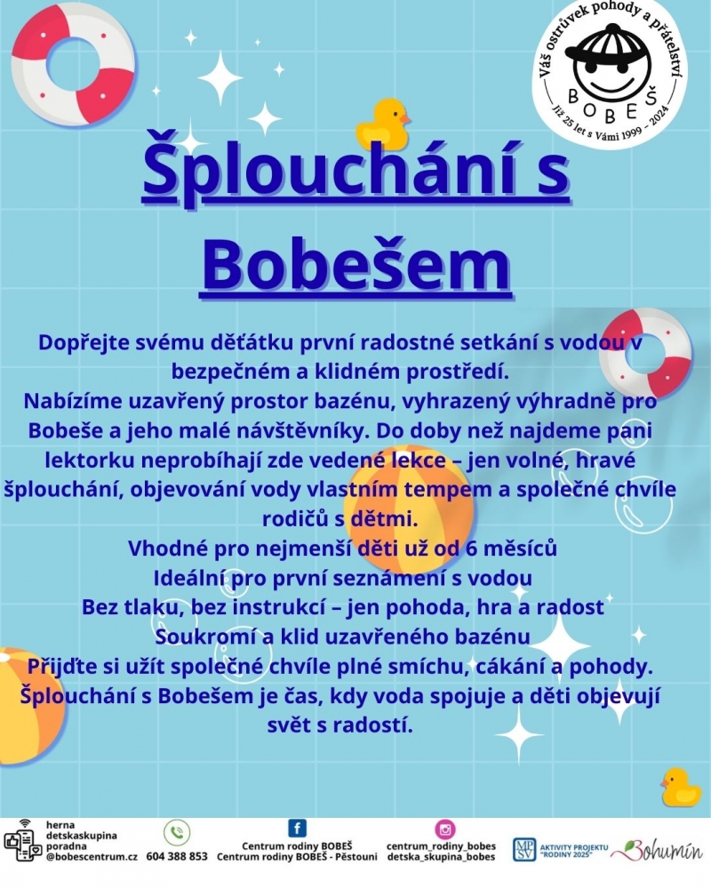 Dopřejte svému děťátku první radostné setkání s vodou v bezpečném a klidném prostředí. Nabízíme uzavřený prostor bazénu, vyhrazený výhradně pro Bobeše a jeho malé návštěvníky. Do doby než najdeme paní ...