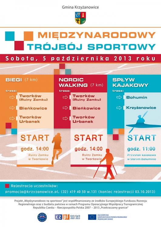 Międzynarodowy Tróbój Sportowy odbędzie się 5 października 2013 roku. Uczestnicy zmierzą się w takich konkurencjach jak: bieg (7 km), nordic walking (7 km) oraz spływ kajakowy po rzece Odrze. Serdecznie zapraszamy!