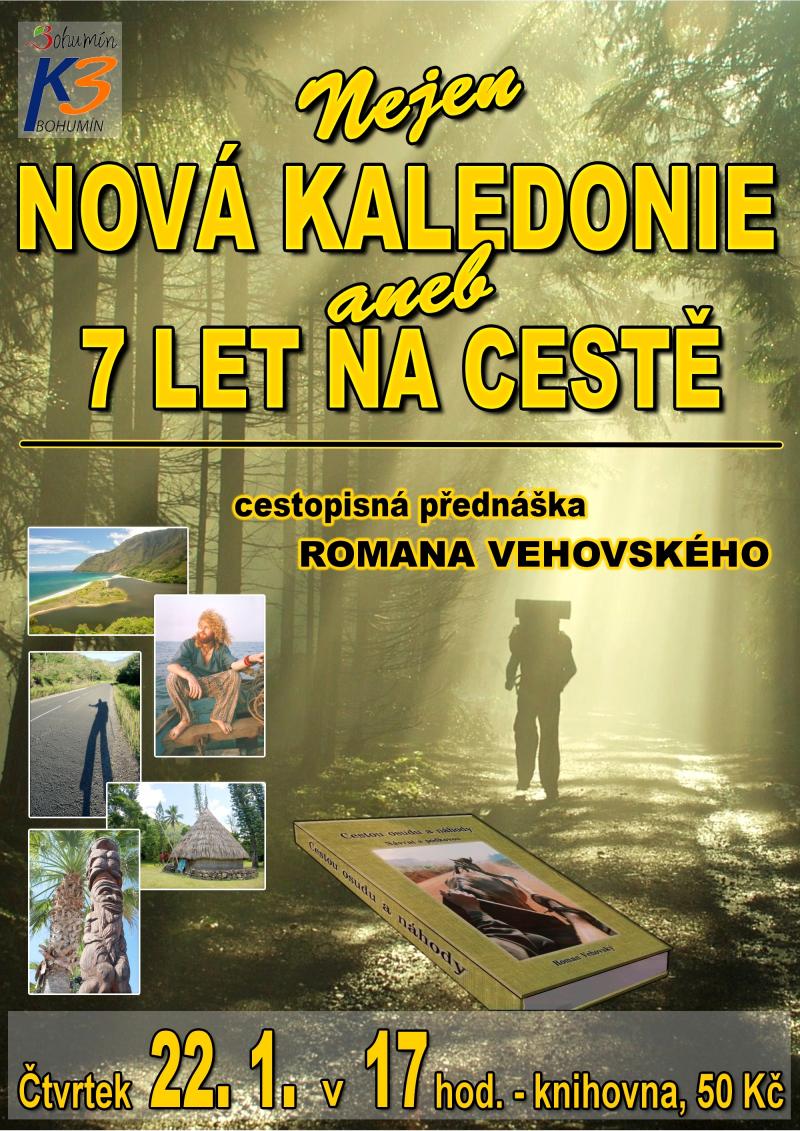 PŘEDNÁŠKA, SETKÁNÍ: Nejen Nová Kaledonie anebo 7 let na cestě - Vyrazit do světa bez jasného cíle a nechat se jen tak unášet náhodou. Roman Vehovský si tento sen splnil a povypráví o tom. Z Nové Kaledonie se přesuneme na Nový Zéland. Lodním stopem se dostaneme ze Severního ostrova na Jižní. Procestujeme národní parky Západní Austrálie a poslední zastávkou bude Srí Lanka, na které se podíváme za slony i čajovými česačkami.