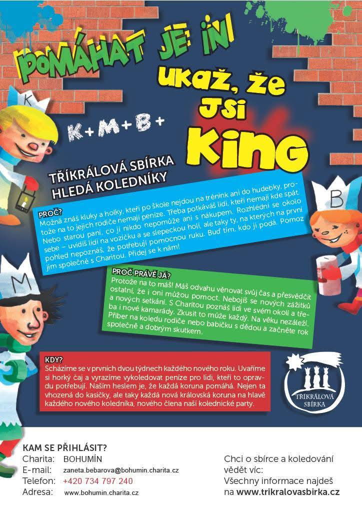 Najdeš chuť a odvahu rozšířit naši kolednickou armádu? Připojit se k desetitisícům dobrovolníků, kteří v kostýmech tří králů prosí o příspěvek na charitní služby, a pomáhají tak starým a nemocným lidem, dětem z chudých rodin nebo lidem na ulici? Koledník má i odpovědnost, reprezentuje největší neziskovou organizaci a dobré jméno Tříkrálové sbírky, která má za sebou už dvacet ročníků. Někteří koledníci se sbírkou vyrostli. Chceš být jedním z nich? V chladném počasí nachodit několik kilometrů, odvážně oslovit člověka, poznat lidi v okolí, nebát se odmítnutí, a především předat radost, potěšit a vzájemně se obdarovat. Odměnou ti bude hřejivý pocit, že jsi udělal něco nesobeckého pro ostatní, že jsi inspiroval jiné, abyste společně začali rok dobrým skutkem. Zapoj se také do Tříkrálové sbírky, která probíhá pravidelně od 1. do 14. ledna a pojď s námi koledovat. Nezáleží na věku, důležité je nadšení a chuť pomáhat. Stačí zavolat nebo poslat sms na + 420 734 797 240.