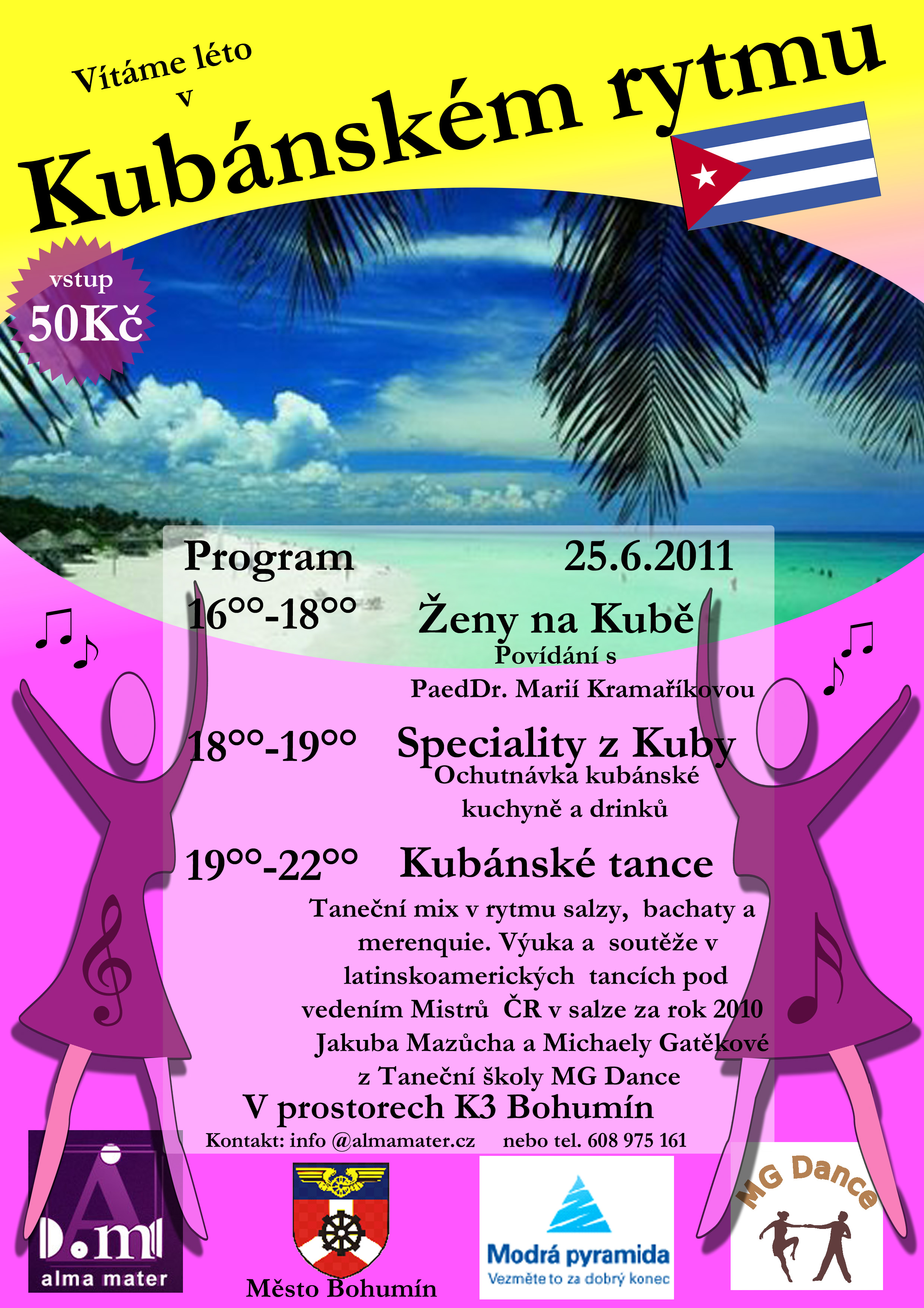 Budeme si povídat o životu a ženách na Kubě s Maruškou Kramaříkovou, která na Kubě žila 4 roky , ochutnáme kubánskou kuchyni a hlavně si zatančíme v kubánských rytmech. Večerem nás budou provázet mistři ČR v Salse za rok 2010, Jakub Mazůch a Michaela Gatěková.Zájemkyně o účast v soutěži jednotlivců párů v latinskoamerických tancích o hodnotné ceny,, která bude součástí večera, ať se registrují na tel. 608975161. Soutěžit se bude ve třech tancích, (salsa, merenque, bachata) které se před tím pod vedením tanečních mistrů naučíte. Porota složená z odborníků i veřejnosti bude hodnotit jak tanec, tak stylové kubánské oblečení tanečníků, které samozřejmě není povinné a záleží pouze na kreativitě soutěžících.( při tvorbě tanečního úboru Vám nabízíme možnost využít 10% dohodnuté slevy v obchodě MAXI DÁMA V Ostravě ,která prodává i zapůjčuje propriety k tanečním kostýmům.) Hodnotit se bude kromě tance a tanečního kostýmu také počet vašich příznivců tzv. přivedeného „roztleskávacího družstva“, které si tanečníci s sebou přivedou.