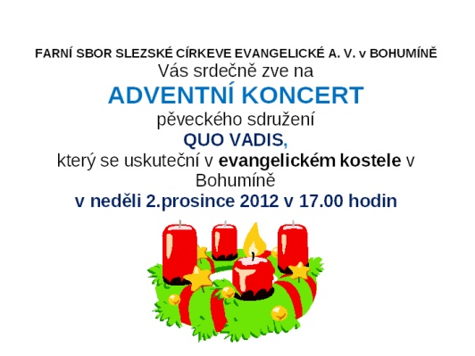 FARNÍ SBOR SLEZSKÉ CÍRKEVE EVANGELICKÉ A. V. v BOHUMÍNĚ Vás srdečně zve na ADVENTNÍ KONCERT pěveckého sdružení QUO VADIS, který se uskuteční v evangelickém kostele v Bohumíně v neděli 2.prosince 2012 v 17.00 hodin.