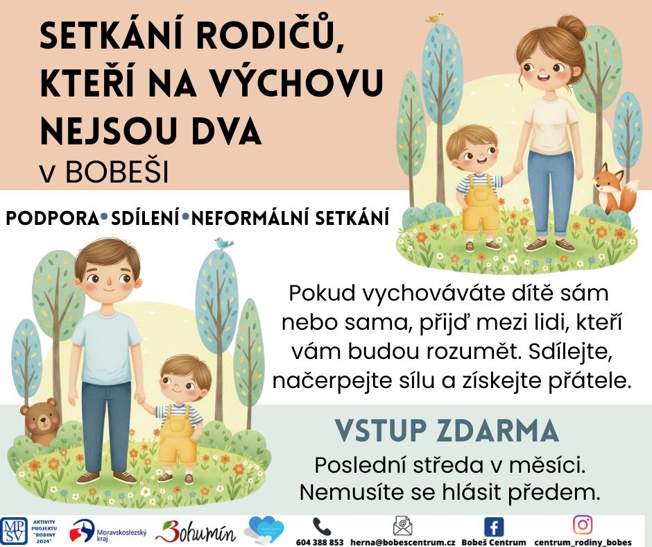 Přijďte načerpat sílu, podporu a rady od ostatních rodičů samoživitelů. Vstupné je zdarma, hlásit se nemusíte. Pravidelně každou poslední středu v měsíci. Autor: CR Bobeš ...