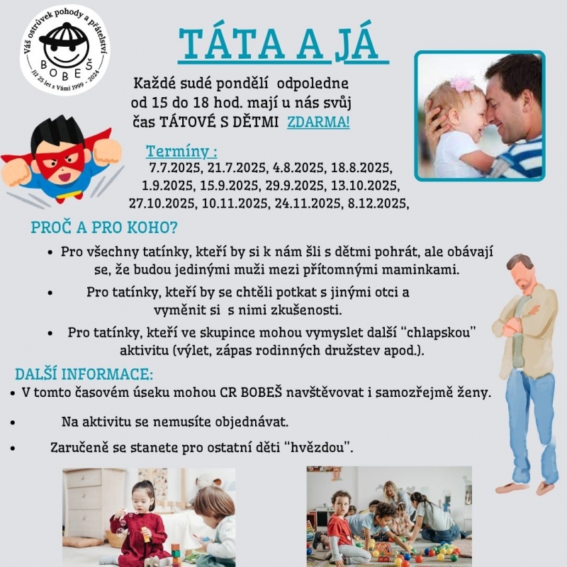 Pravidelná aktivita, každé sudé pondělí, kdy mají u nás tátové VSTUP ZDARMA. Sudé pondělky, odpoledne od 15:00 do 17:45. Pro koho je určeno? pro všechny tatínky, kteří by rádi získaly rady od ostatníc ...