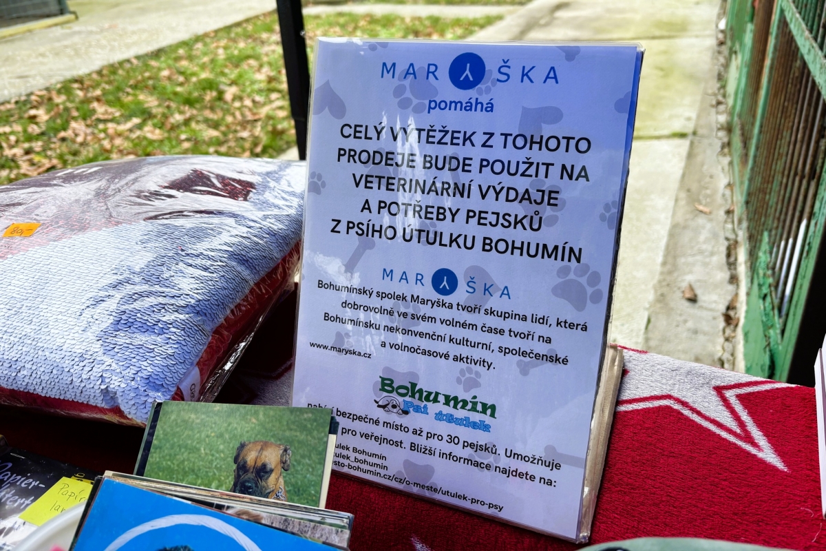 „Vybranými penízky podpoříme veterinární úkony a péči o opuštěné pejsky, kteří našli dočasný azyl v bohumínském útulku,“ uvedla Kamila Smigová, předsedkyně spolku Maryška. Na mini jarmarku se podílely Krojovanky se svými „klenoty z půd a almar“, výrobci regionálních poctivých potravin, autoři rukodělných výrobků, k mání byly také oblečky, hračky a pomůcky pro pejsky, knihy a další sortiment.