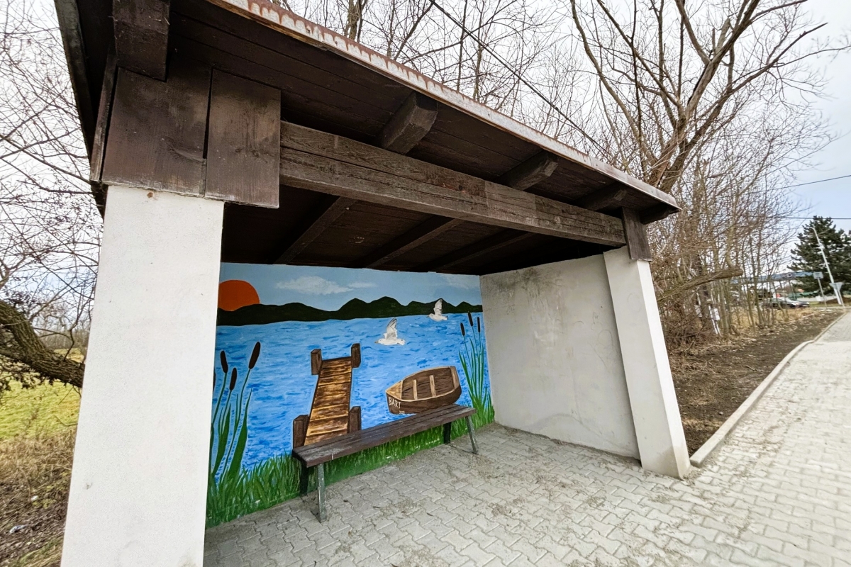 Uvnitř přístřešku vznikla barevná scéna, která evokuje pohodu u vody. Za skutečnou lavičkou pro cestující se rozprostírá hladina s molem, rákosím a loďkou. Autorkou návrhu je výtvarnice Magdalena Bischofová.